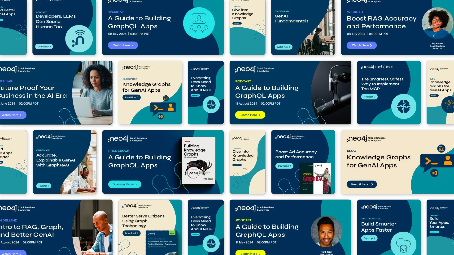 Neo4j was founded to help companies make sense of their data using knowledge graphs. In order to reach end-user app developers as well as executive decision makers, the brand needed to show up consistently globally, yet be nuanced for each audience segment. After a foundational rebrand in late 2023, the Neo4j brand was ready to evolve further mid-2024. The challenge was to evolve and expand the Neo4j brand identity and supporting processes so that the Brand Creative team could execute more quickly at scale, and enable internal stakeholders to launch their initiatives on brand, on time.